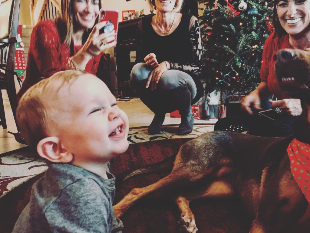 Nine-month-old Caeden thriving with the big pups.