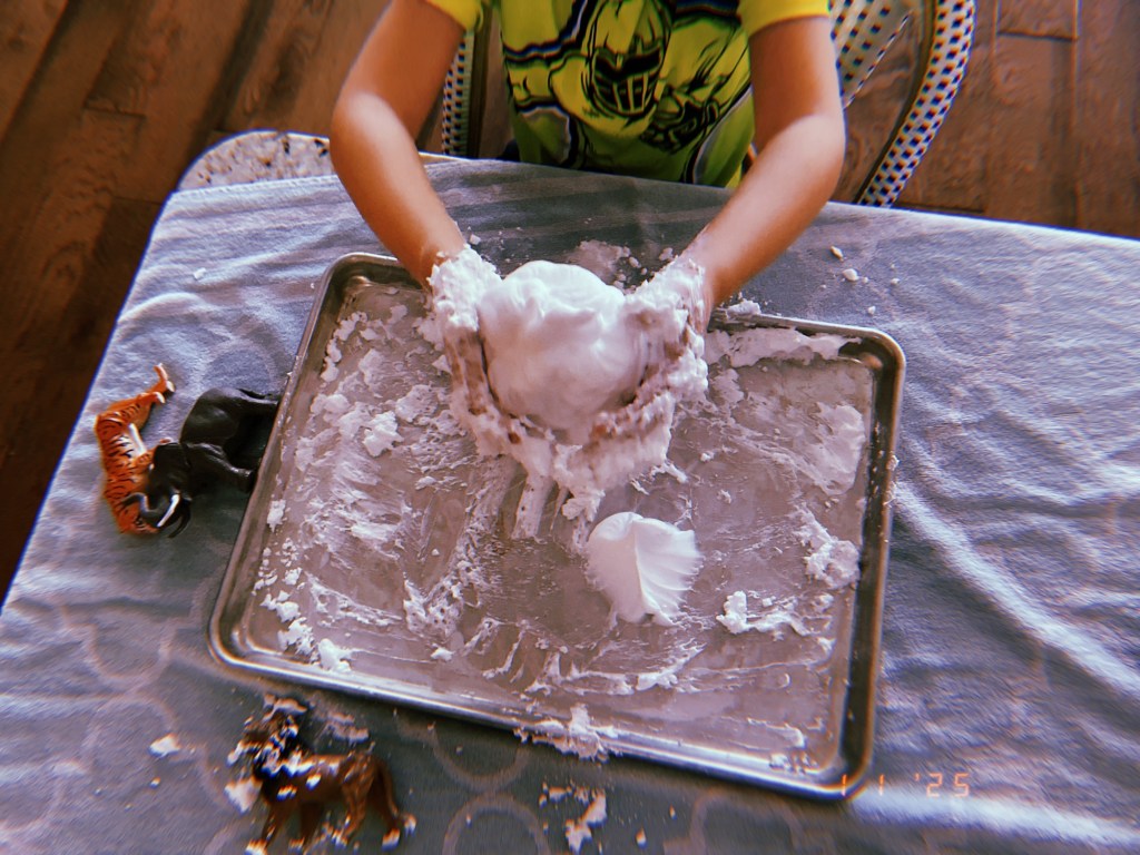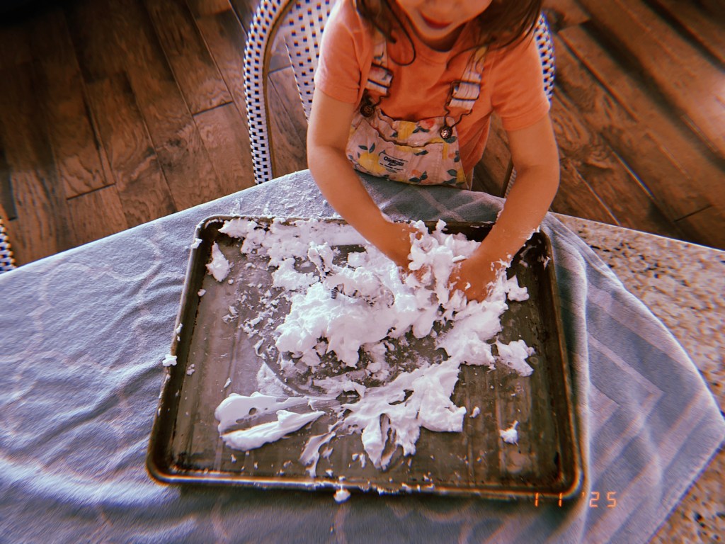 In an old plastic cup, you mix baking soda with food dye (if desired) and a portion of one egg white. Then pour some vinegar into the cup and watch the magic! It’s so neat!