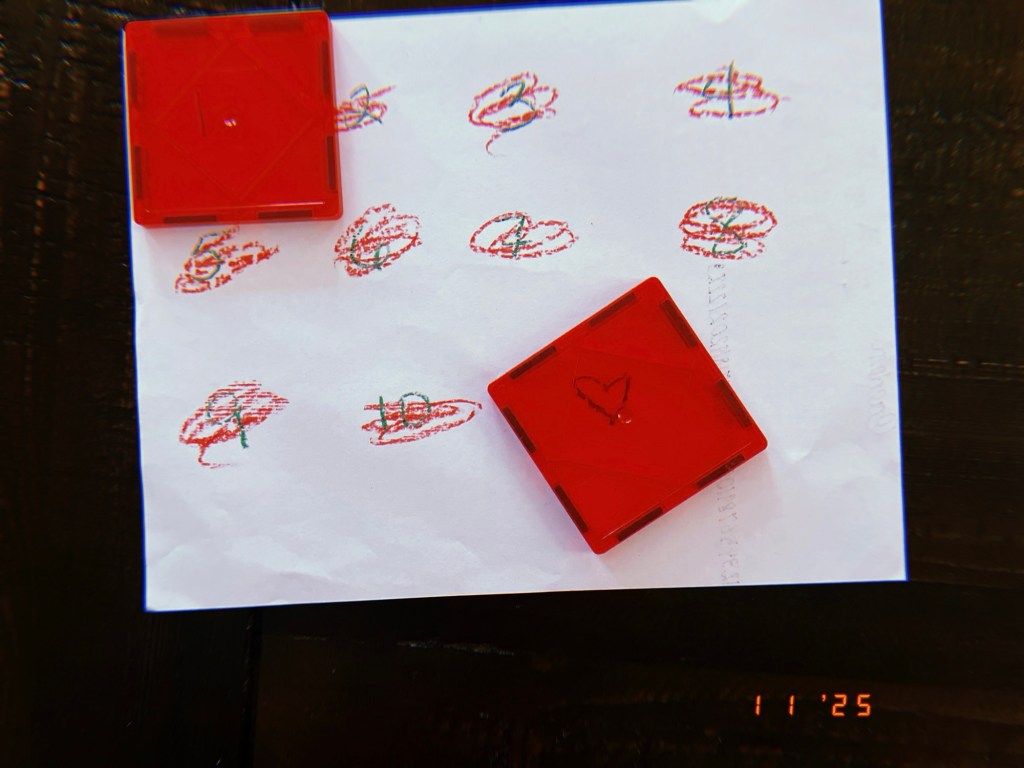 For a clean alternative there was this magic with magnet tiles. I took a dark crayon and wrote numbers on the page (you could write messages, etc) and matched whatever color the magnet was I scribbled over each number. So when you pass the tile over them you can clearly see what was written beneath.