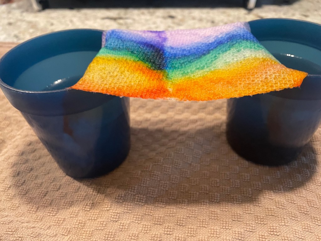 It’s so easy! Just use markers to color the rainbow on either end of a long piece of paper towel. Then have both sides dipped into cups. And just watch the rainbow grow!